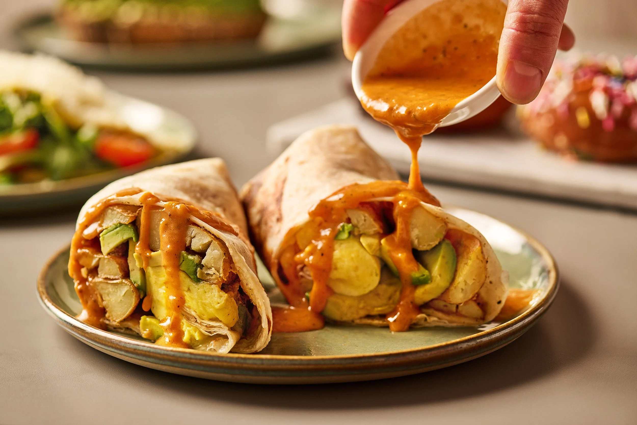 Close-up of breakfast burritos with cage-free eggs, house breakfast potatoes, melty white cheddar cheese, and drizzled with house-crafted salsa.