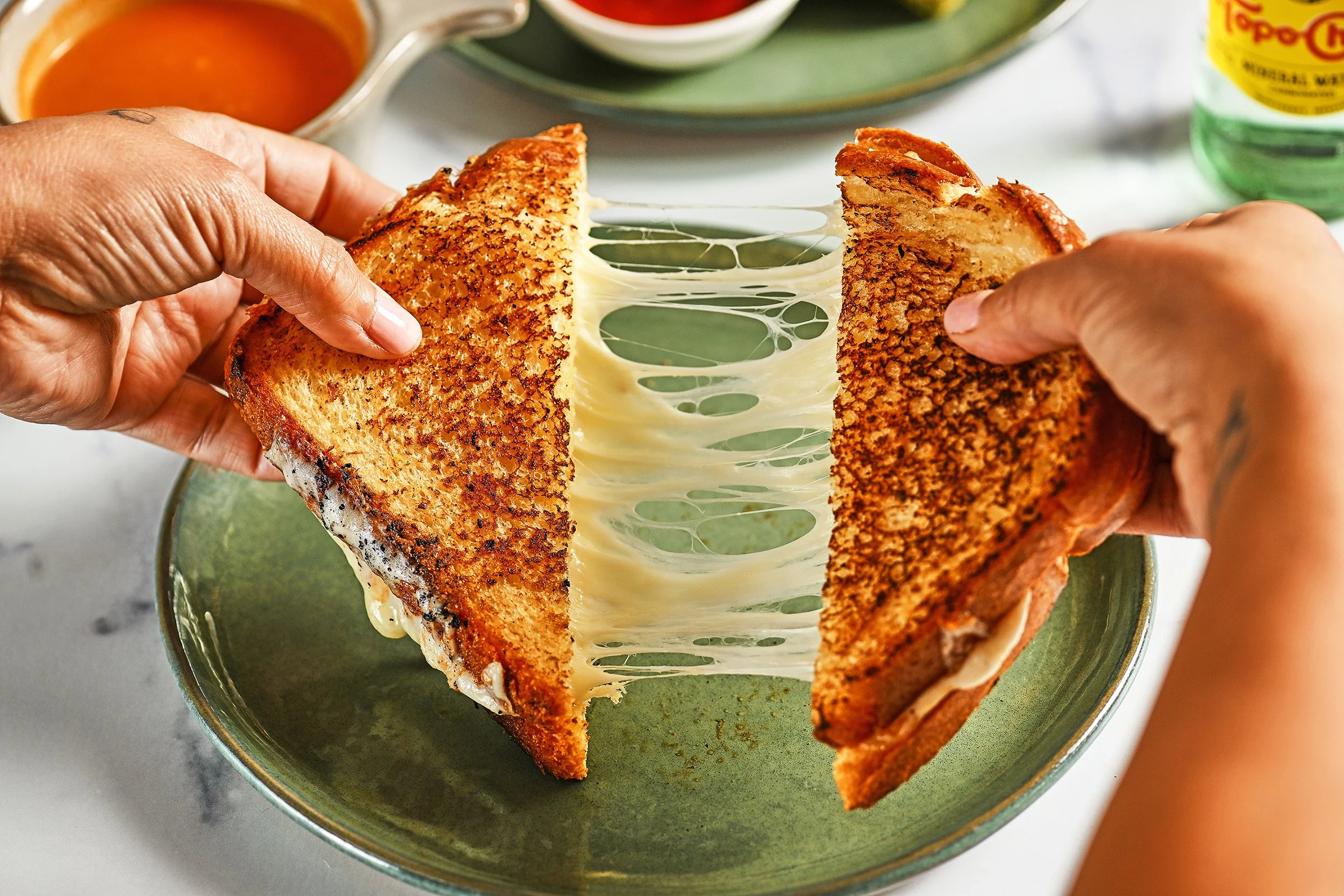 A person is pulling apart a grilled cheese sandwich, revealing melted white cheddar and mozzarella cheese stretching between the slices of toasted egg bread.